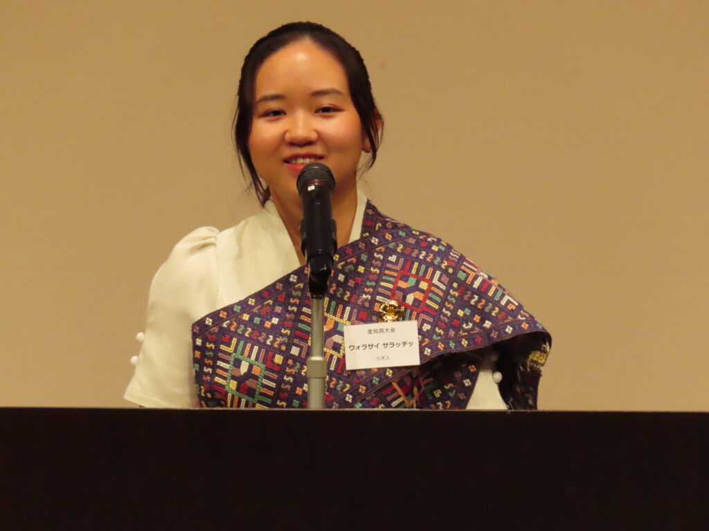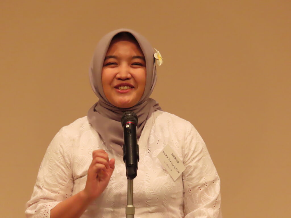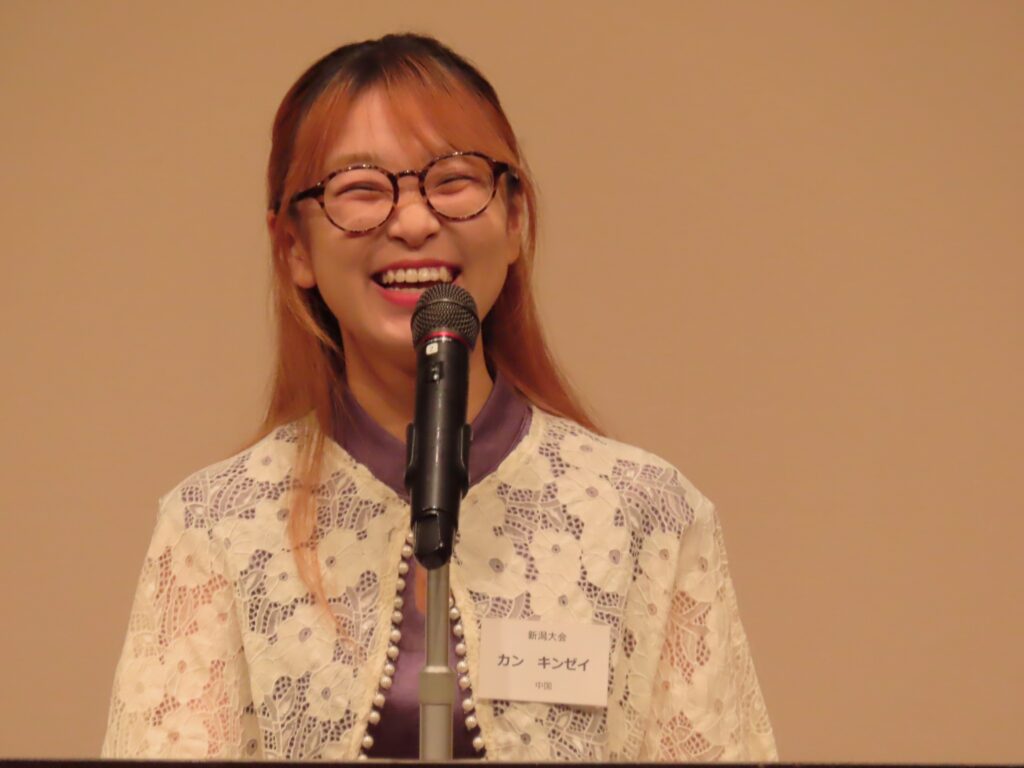 見事、優勝に輝いたカンさん。「私の日本留学生活」をテーマに、「心のある場所、それが私の故郷(ふるさと)」と題して、スピーチを行いました。