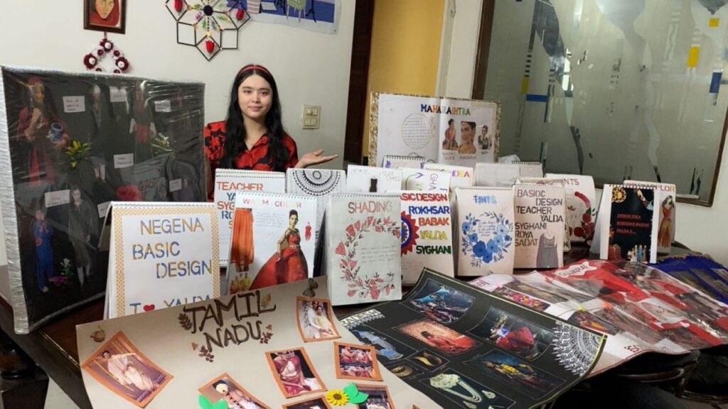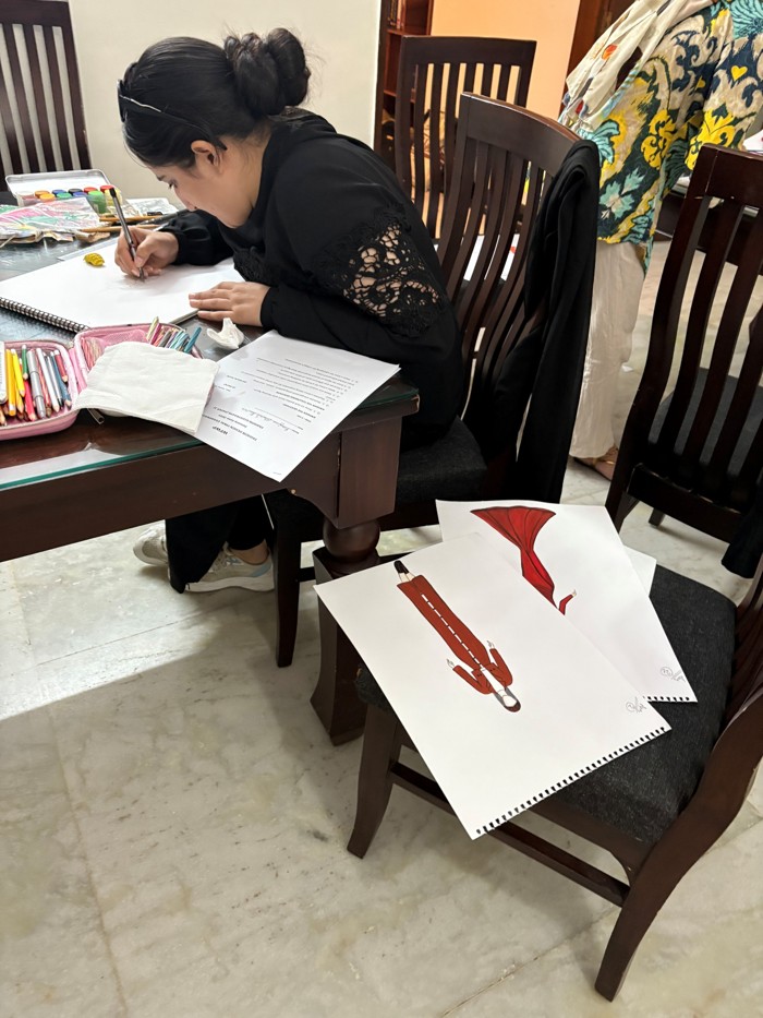 ①デザイン基本コース (9名全員修了) 6日間にわたる筆記テストのほか、伝統的な刺繍(ししゅう)やデザイン画の制作など、時間内に作品を仕上げる厳しい課題に挑みました。