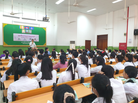 クラチェ州教育局の協力を得て、クラチェ大学にて、近郊の高校生、大学生を対象に青年教育プログラムを行いました。3つの高校、1つの大学から合計360人が参加、各学校から先生方も招きました。