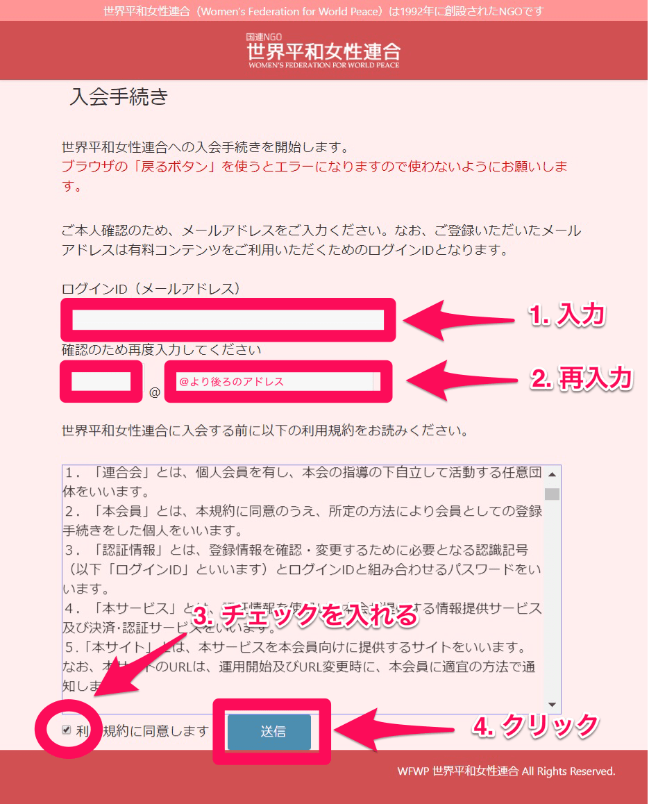 2. 登録用メールアドレスを入力します。「利用規約に同意します」にチェックを入れたら「送信」ボタンをクリックします
