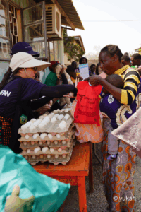 子供たちの体重測定や母子手帳への記録、大豆粉と卵の配布、大豆粉おかゆの調理などを体験。現地の母親たちが理解しやすいように、日本のユースが事前に作成したチャートを使って栄養指導も行いました。